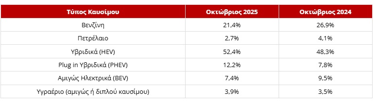 Τα καινούργια αυτοκίνητα που κυκλοφόρησαν τον Οκτώβριο του 2025 ανέρχονται σε 10.768 έναντι 9.670 που κυκλοφόρησαν τον αντίστοιχο μήνα του έτους 2024, παρουσιάζοντας αύξηση 11,4%.