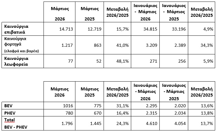 Κατά 15,7% περισσότερα ήταν τα νέα επιβατικά αυτοκίνητα τον Μάρτιο του 2026 σε ετήσιους όρους, σύμφωνα με την ΕΛΣΤΑΤ. Για το διάστημα Ιανουαρίου-Μαρτίου 2026, οι ταξινομήσεις νέων επιβατικών επίσης κατέγραψε άνοδο, της τάξης του 4,9%.