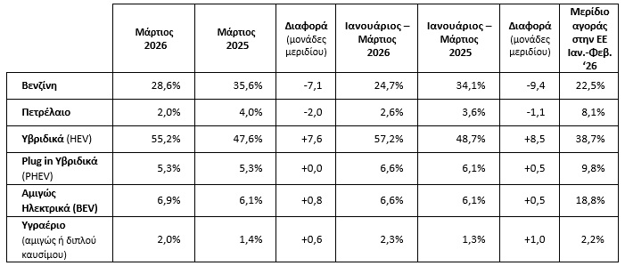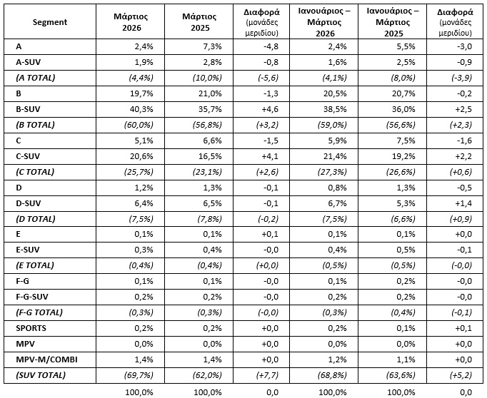 Σύμφωνα με πρώτους υπολογισμούς, η πρόοδος στα segments επιβατικών και στην κατανομή ανά καύσιμο, ως τον Μάρτιο, έχει ως εξής: