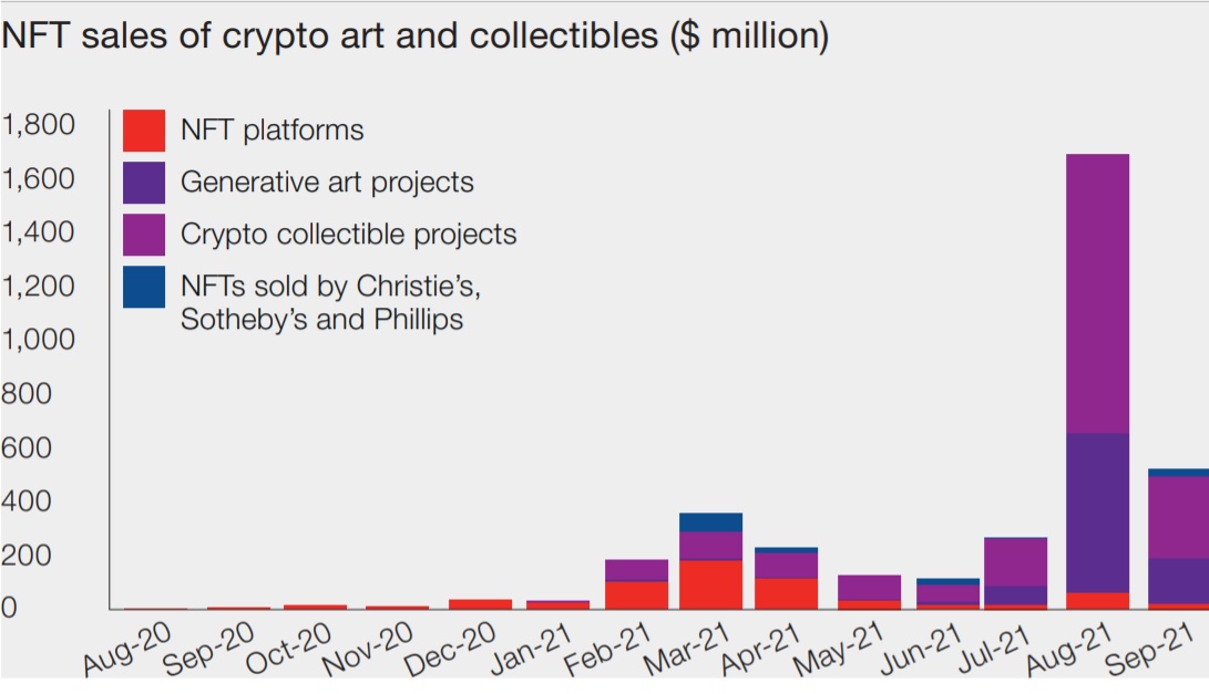 Τον Μάρτιο που μας πέρασε, είχε ήδη καταγραφεί ένας απίστευτα υψηλός τζίρος των NFT να αγγίζουν συνολικά τα 356 εκατομμύρια δολάρια. Πέντε μήνες αργότερα, τον Αύγουστο, ο αντίστοιχος τζίρος εκτοξεύθηκε στα 1,7 δισ. δολάρια, ενώ μέχρι αυτή την ώρα, έχουν επενδυθεί πάνω από 3,5 δισεκατομμύρια δολάρια.