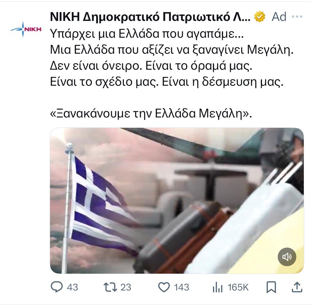 Η κάτω βόλτα που πήρε το κόμμα της Νίκης φαίνεται ότι ανάγκασε τους επιτελείς του να προχωρήσουν μέχρι και σε πληρωμένες καταχωρίσεις στα social media, μήπως μαζέψουν τα ασυμμάζευτα. Μάλιστα, εκείνο που μου προξένησε εντύπωση είναι ότι χρησιμοποιούν ένα μεταφρασμένο σύνθημα, που δεν είναι άλλο από το Make America Great Again, μετατρέποντας το σε «Ξανακάνουμε την Ελλάδα Μεγάλη».