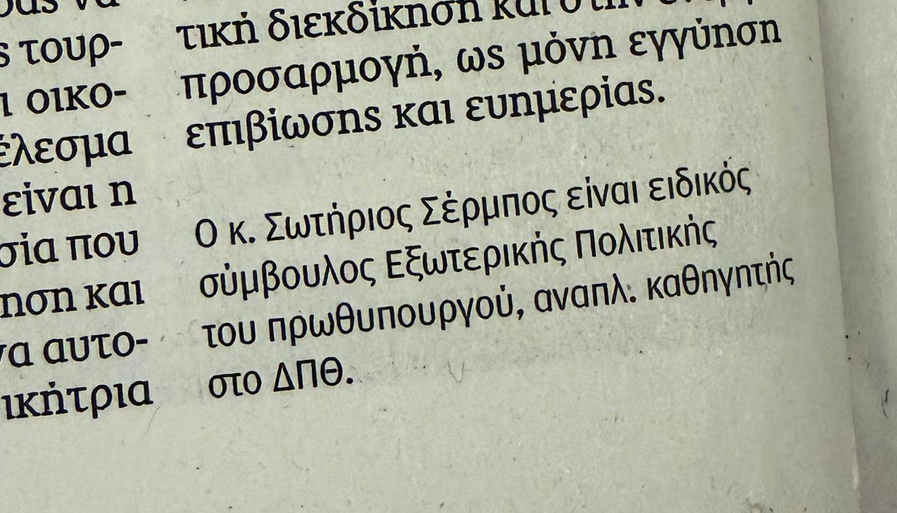 Και μια και ανέφερα ότι ο καθένας κάνει του κεφαλιού του, να σας πω ότι, ενώ δεν υπάρχει καμία επίσημη ανακοίνωση σε σχέση με την ανάληψη των καθηκόντων του καθηγητή Σωτήρη Σέρμπου ως ειδικού συμβούλου εξωτερικής πολιτικής του πρωθυπουργού, ο ίδιος χθες έσπευσε να αυτοανακηρυχθεί, υπογράφοντας φαρδιά πλατιά με τη συγκεκριμένη ιδιότητα άρθρο στην «Καθημερινή». Αυτά βλέπει ο Φουσκίδης και σε πολύ λίγο θα παρουσιαστεί εκδότης στα «Παραπολιτικά», ερήμην του Κουρτάκη.