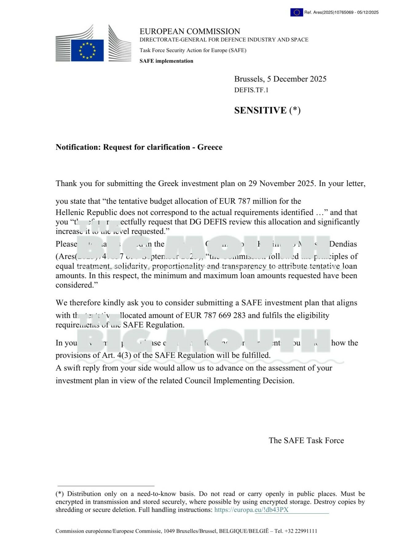Τυχαία, και το εννοώ, μέσα στο Σαββατοκύριακο έφθασε στα χέρια μου, για την ακρίβεια στο mail μου, ένα σημείωμα, σύμφωνα με το οποίο μέχρι τις 12 Δεκεμβρίου η χώρα μας, είναι υποχρεωμένη να επαναϋποβάλει ένα κανονικό πλάνο για έργα ύψους 780 εκατ. ευρώ από το πρόγραμμα SAFE. Αν κατάλαβα καλά, διαβάζοντας το επίμαχο έγγραφο, οι Ευρωπαίοι, που ελέγχουν όσα τους στέλνουν οι κυβερνήσεις των κρατών-μελών, δεν ήταν και τόσο ενθουσιασμένοι από τα υπό ένταξη έργα που τους στείλαμε, προκειμένου να ενταχθούν στο πρόγραμμα SAFE. Αν κατάλαβα καλά, γιατί από αυτά δεν σκαμπάζω, μας ζητούν να βεβαιωθούμε για κάτι μεμονωμένες προμήθειες, οι οποίες δεν είναι και τόσο εναρμονισμένες (αν και πάλι έχω καταλάβει) με τον κανονισμό του SAFE. Επειδή υπάρχει σοβαρός κίνδυνος να χαθούν πολλά λεφτά, κοντά στα 800 εκατ. ευρώ, αφού αυτά που τους στείλαμε είναι για γέλια, νομίζω ότι επιβάλλεται να γίνει αυτό που πρέπει και όχι αυτό που «μαγειρεύουν» κάποιοι περίεργοι του Πενταγώνου, πίσω από την κεντρική κυβέρνηση και τον υπουργό Δένδια.