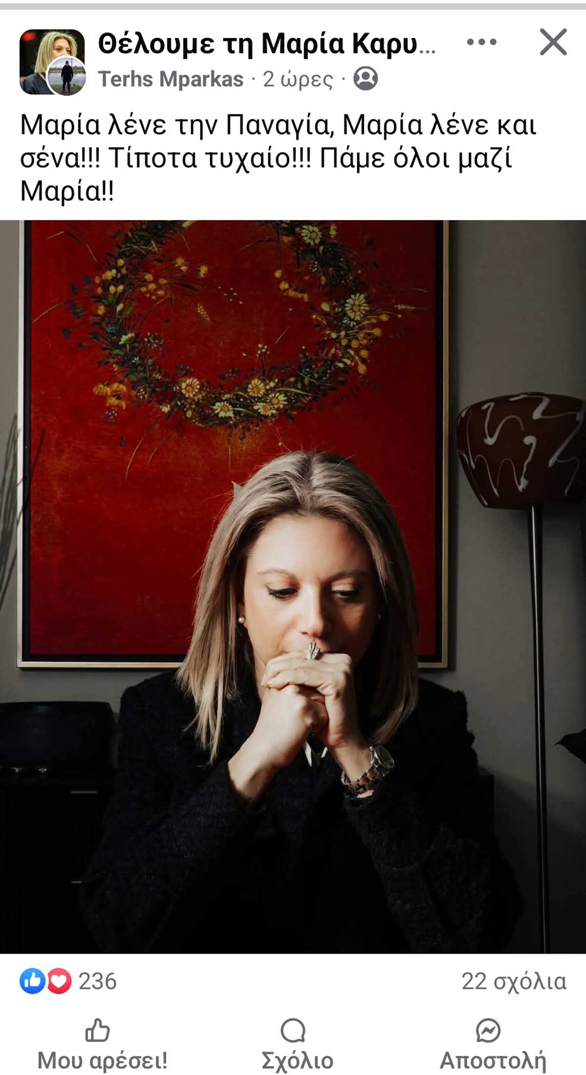 Το αλίευσα από σελίδα φίλων της Μαρίας Καρυστιανού στο Facebook και το αφήνω εδώ, για να δούμε πού μπορεί να φτάσει η νέα πολιτική σχιζοφρένεια υπέρ της Μαρίας. «Μαρία λένε την Παναγιά, Μαρία λένε και σένα!!! Τίποτα τυχαίο!!! Πάμε όλοι μαζί, Μαρία!!!». Κύριε, ελέησον!