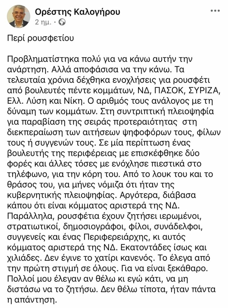 Τον καθηγητή του ΑΠΘ Ορέστη Καλογήρου δεν τον γνωρίζω προσωπικά, ούτε τον έχω συναντήσει ποτέ. Ξέρω μόνο ότι εδώ και κάποια χρόνια υπηρετεί ως πρόεδρος του ΔΟΑΤΑΠ – του παλιού ΔΙΚΑΤΣΑ, που αν δεν είχες μπάρμπα στην Κορώνη μπορεί να έκανες και τρία χρόνια για να αναγνωρίσουν το πτυχίο της Οξφόρδης ως ισοδύναμο του εγχώριου τμήματος Αγγλικής Φιλολογίας. Διαβάζοντας, λοιπόν, δύο πρόσφατες αναρτήσεις του καθηγητή Καλογήρου, νομίζω αξίζει να κρατήσετε 2-3 σημεία απ’ όσα έγραψε. Ξεκινώ με το πρώτο: «Τα τελευταία χρόνια δέχθηκα ενοχλήσεις για ρουσφέτι από βουλευτές πέντε κομμάτων, ΝΔ, ΠΑΣΟΚ, ΣΥΡΙΖΑ, Ελλ. Λύση και Νίκη. Ο αριθμός τους, ανάλογος με τη δύναμη των κομμάτων. Στη συντριπτική πλειοψηφία για παραβίαση της σειράς προτεραιότητας. Παράλληλα, ρουσφέτια έχουν ζητήσει ιερωμένοι, στρατιωτικοί, δημοσιογράφοι, φίλοι, συνάδελφοι, συγγενείς και ένας περιφερειάρχης, κι αυτός κόμματος αριστερά της ΝΔ. Εκατοντάδες, ίσως και χιλιάδες». Αυτό για να μην υπάρχει κάποια αμφιβολία ότι το ρουσφέτι έχει πολιτικό χρώμα.