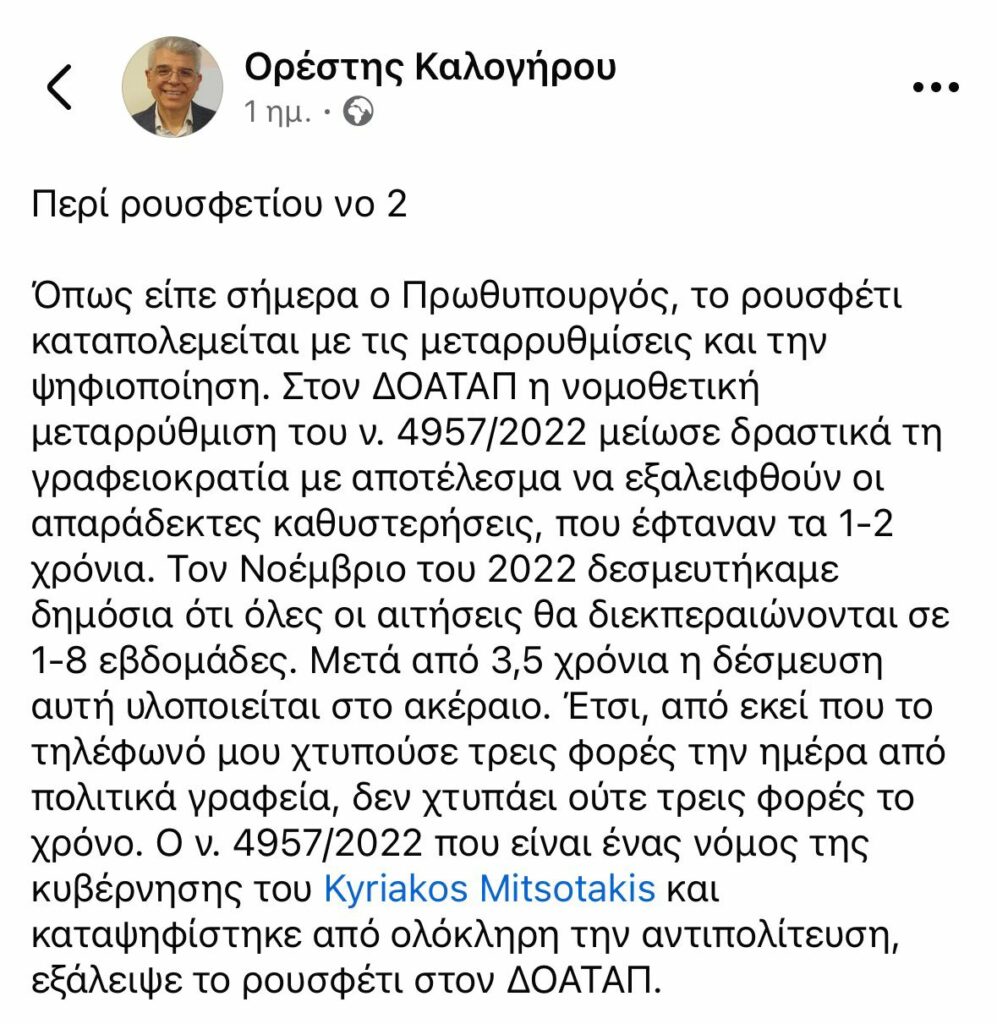 Η συνέχεια, όμως, έχει περισσότερο ενδιαφέρον: «Στον ΔΟΑΤΑΠ η νομοθετική μεταρρύθμιση του ν. 4957/2022 μείωσε δραστικά τη γραφειοκρατία, με αποτέλεσμα να εξαλειφθούν οι απαράδεκτες καθυστερήσεις, που έφταναν τα 1-2 χρόνια. Τον Νοέμβριο του 2022 δεσμευτήκαμε δημόσια ότι όλες οι αιτήσεις θα διεκπεραιώνονται σε 1-8 εβδομάδες. Ύστερα από 3,5 χρόνια η δέσμευση αυτή υλοποιείται στο ακέραιο. Έτσι, από εκεί που το τηλέφωνό μου χτυπούσε τρεις φορές την ημέρα από πολιτικά γραφεία, δεν χτυπάει ούτε τρεις φορές τον χρόνο». Τι μαθαίνουμε εδώ από τον καλό καθηγητή; Ότι το πελατειακό κράτος καταπολεμάται με «καλό κράτος», αυτό, δηλαδή, που κάνει σωστά και γρήγορα τη δουλειά του. Και το τρίτο και καλύτερο που αναφέρει ο Καλογήρου είναι ότι «ο ν. 4957/2022, που είναι ένας νόμος της κυβέρνησης του Κυριάκου Μητσοτάκη και καταψηφίστηκε από ολόκληρη την αντιπολίτευση, εξάλειψε το ρουσφέτι στον ΔΟΑΤΑΠ». Αυτά, για να ξέρουμε ποιοι προσπαθούν (αλλού πετυχαίνοντας και αλλού αποτυγχάνοντας) και ποιοι παριστάνουν στα λόγια τους τιμωρούς των ρουσφετιών, γιατί θέλουν να κάνουν τα δικά τους, τα προοδευτικά.