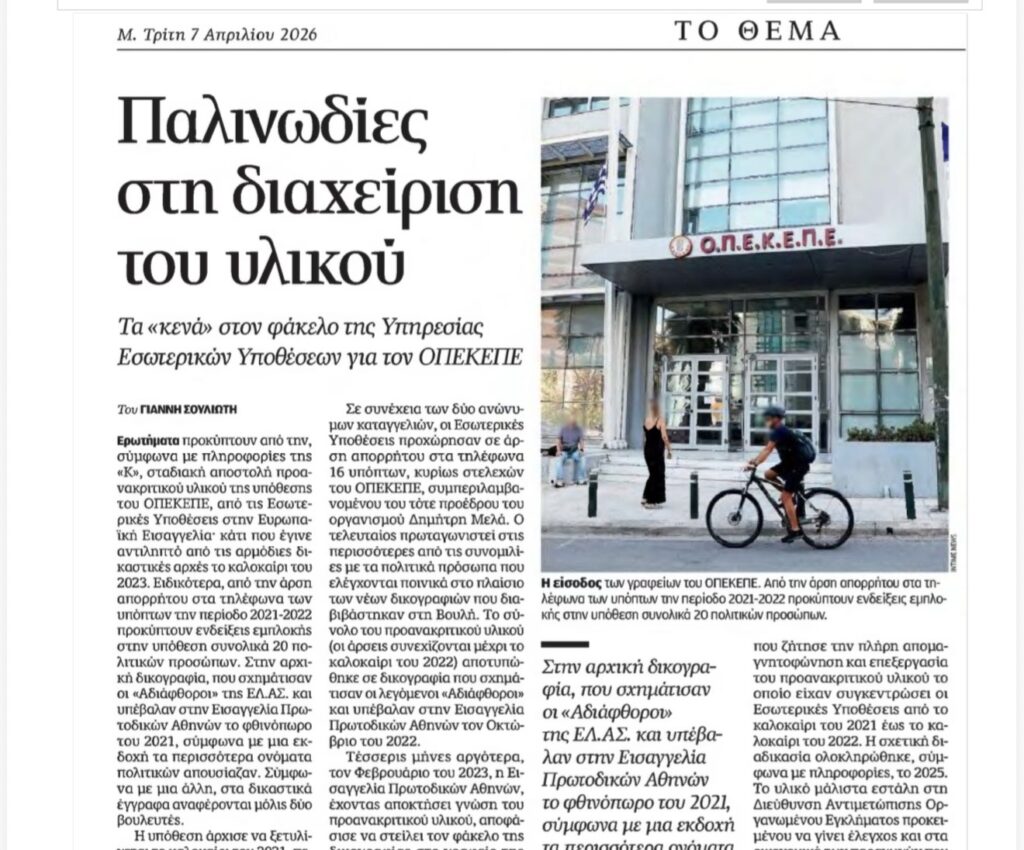 Ένας από τους αγαπημένους μου, αστυνομικούς συντάκτες, σταθερά και διαχρονικά, είναι ο Γιάννης Σουλιώτης της «Καθημερινής» του Αλαφούζου. Τον διαβάζω , όπως το Ευαγγέλιο οι παπάδες. Αυτό έκανα και χθες το πρωί, όταν είδα την υπογραφή του σε ένα ρεπορτάζ για τον ΟΠΕΚΕΠΕ. Ήταν όμως απογοητευτική, οφείλω να ομολογήσω, η ανάγνωση, δεδομένου ότι το ρεπορτάζ της ναυαρχίδας του Φαλήρου όσοι είστε πιστοί αναγνώστες της στήλης το έχετε διαβάσει σε τούτη εδώ τη γωνίτσα, από τα μέσα του περασμένου μήνα. Συγκεκριμένα, στις 19-03-2026 σας έγραφα πως ο κοριός του Εσωτερικών Υποθέσεων «έπιασε» στα πράσα τους Νεοδημοκράτες βουλευτές και άλλα διάφορα που «αποκάλυψε» με κάποια χρονοκαθυστέρηση η «Καθημερινή». Λίγες μέρες αργότερα, και πάλι μέσω της στήλης, στις 2-4-2026 είχα αποκαλύψει την κόντρα που είχε ξεσπάσει ανάμεσα στον τότε υπουργό Προστασίας του Πολίτη, Τάκη Θεοδωρικάκο, και τον επικεφαλής του Εσωτερικών Υποθέσεων, Ηλία Κοσσυβάκη. Μάλιστα, σε αντίθεση με το χθεσινό ρεπορτάζ, σε μας εδώ αναφέρονταν διευθύνσεις και ονόματα, εκτός από τις ημερομηνίες και όλα τα συναφή. Τα αναφέρω όλα αυτά για να μην ξεχνιόμαστε, μέρες που είναι.
