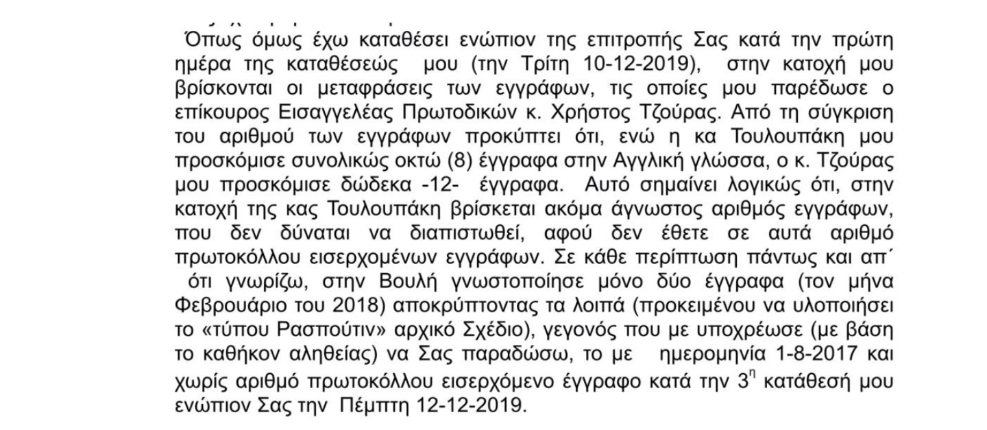 -Συνεπώς, κατά τον Αγγελή υπάρχουν αγγλικά έγγραφα που δεν του προσκομίστηκαν αλλά που σίγουρα τα είχε η Τουλουπάκη στη διάθεση της και είναι βέβαιο ότι θα τα προσκόμισε στην ανακρίτρια για να ελαφρύνει τη θέση της. Στα κείμενα που προσκόμισε ο Αγγελής, χοντρικά θα έλεγε κανείς ότι στο έγγραφο του Δεκεμβρίου του 2016 υπάρχουν γενικές περιγραφές ενώ στο κείμενο του Μαΐου του 2017, υπάρχουν και ονομαστικές αναφορές, ενώ κατά τα λοιπά είναι ακριβώς με το ίδιο περιεχόμενο.