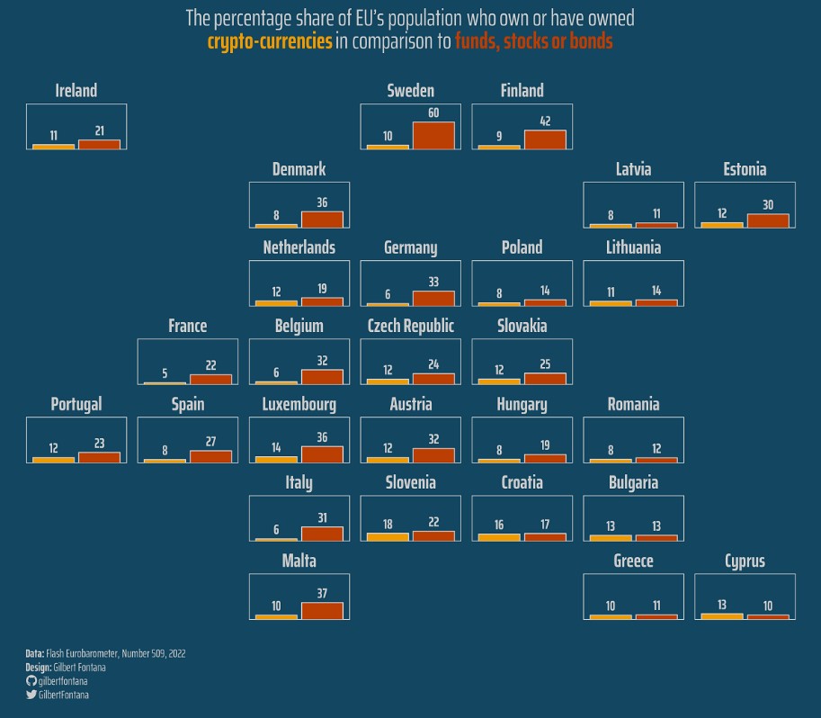 Από τα συγκεκριμένα στατιστικά προκύπτει ότι τα πλουσιότερα ευρωπαϊκά κράτη είναι εκείνα που εμπιστεύονται λιγότερο τα κρυπτονομίσματα, δίνοντας την ψήφο εμπιστοσύνης τους σε παραδοσιακά επενδυτικά εργαλεία.