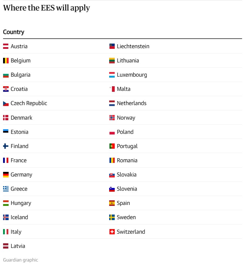 Οι μη Ευρωπαίοι πολίτες που ταξιδεύουν στη ζώνη Σένγκεν – 29 χώρες, συμπεριλαμβανομένων 25 της ΕΕ, καθώς και η Ελβετία, η Νορβηγία, το Λιχτενστάιν και η Ισλανδία – θα εισέρχονται σύντομα χρησιμοποιώντας το νέο σύστημα. Η Ιρλανδία και η Κύπρος θα συνεχίσουν τη χειροκίνητη επεξεργασία των διαβατηρίων των εισερχόμενων επιβατών. Το Ηνωμένο Βασίλειο δεν ανήκει στη ζώνη Σένγκεν. Αντί για σφραγίδες, οι χώρες της ζώνης θα καταγράφουν τα πρόσωπα, τα δακτυλικά αποτυπώματα και τις ημερομηνίες εισόδου και εξόδου των ταξιδιωτών.