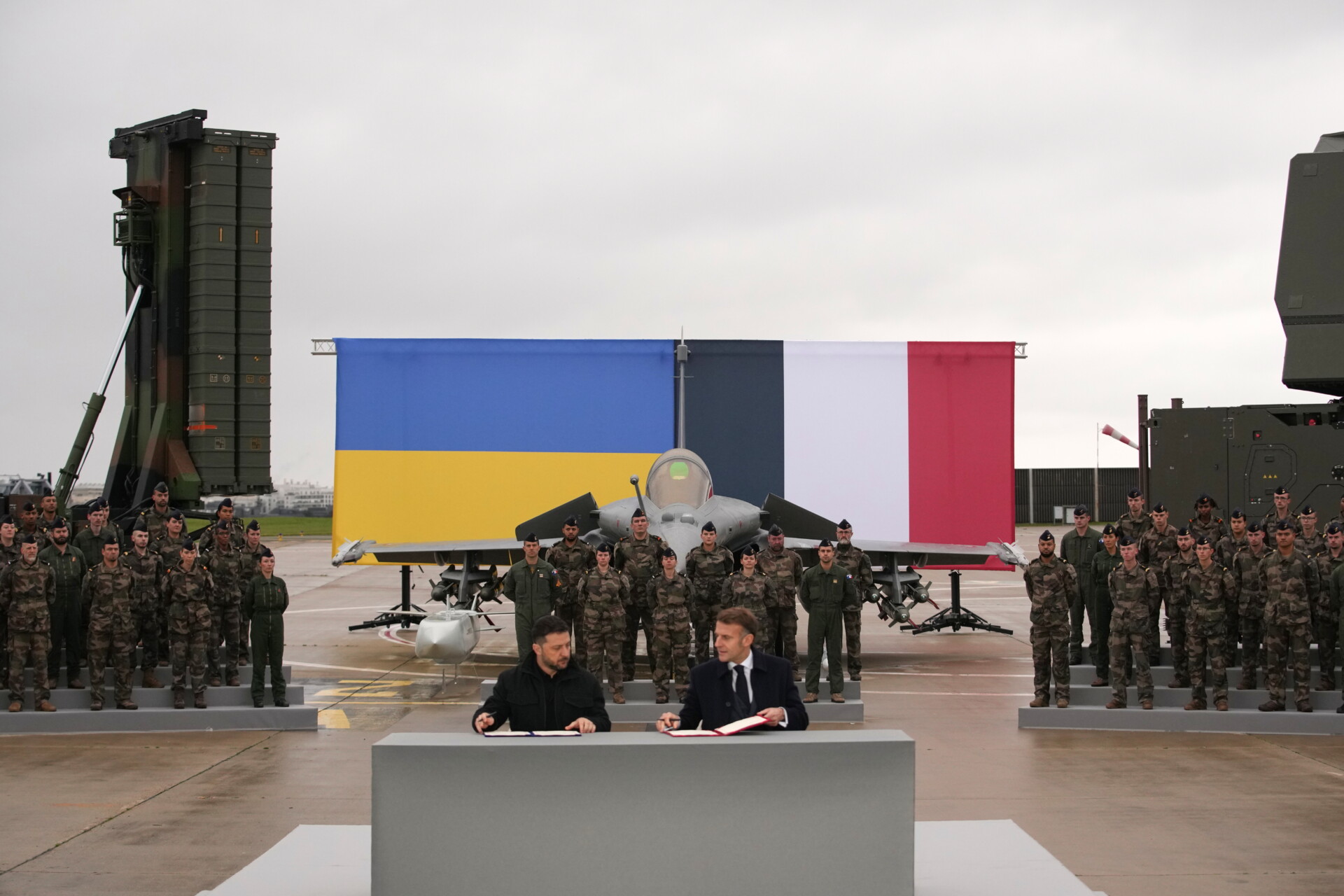 Σε μία από τις σημαντικότερες στρατιωτικές κινήσεις από την αρχή του πολέμου, η Ουκρανία και η Γαλλία υπέγραψαν τη Δευτέρα 17 Νοεμβρίου μια «ιστορική», όπως χαρακτηρίστηκε από το Ελιζέ, συμφωνία για την αγορά έως και 100 μαχητικών Rafale. Η υπογραφή έγινε παρουσία του Εμανουέλ Μακρόν και του Βολοντίμιρ Ζελένσκι στην αεροπορική βάση του Βιλακουμπλέ, κοντά στο Παρίσι.