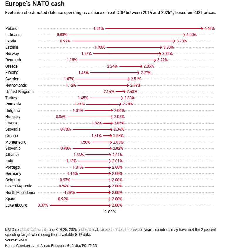 Τα χρήματα που ξοδεύει η Ευρώπη για στρατιωτικές δαπάνες στο πλαίσιο του ΝΑΤΟ στο ΝΑΤΟ. Στοιχεία εκτιμώμενων αμυντικών δαπανών ως ποσοστό του πραγματικού ΑΕΠ μεταξύ 2014 και 2025 ©Politico/Stockholm International Peace Research Institute