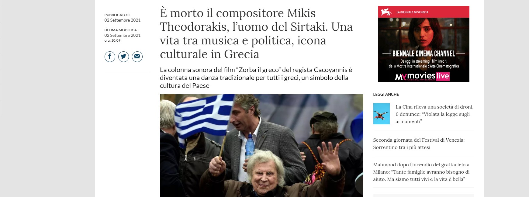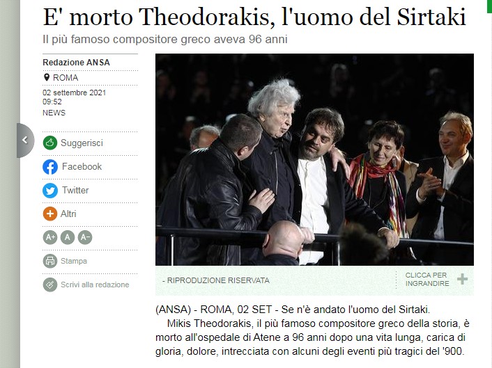 «Πένθος, έφυγε ο Μίκης Θεοδωράκης, ο συνθέτης του «Ζορμπά» που δημιούργησε το συρτάκι». «Ο πιο γνωστός έλληνας συνθέτης κάθε εποχής, πέθανε σε νοσοκομείο της Αθήνας, σε ηλικία 96 ετών, μετά από μια μακρά ζωή, γεμάτη τιμές, πόνο, συνυφασμένη με ορισμένα από τα τραγικότερα γεγονότα του περασμένου αιώνα», γράφει το ιταλικό πρακτορείο ειδήσεων Ansa.