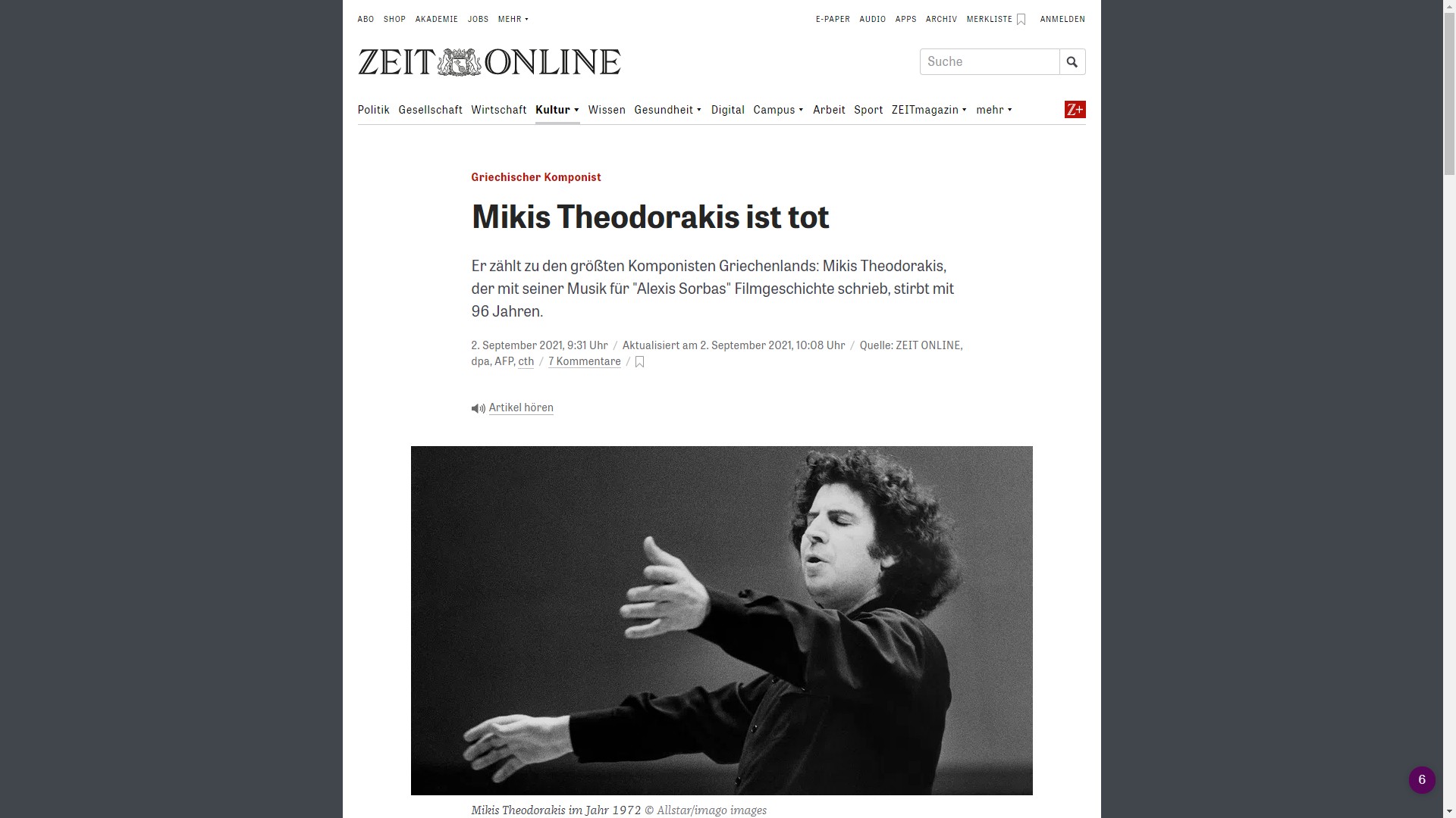 «Συγκαταλέγεται στους μεγαλύτερους συνθέτες της Ελλάδας. Ο Μίκης Θεοδωράκης, ο οποίος με τη μουσική για τον Αλέξη Ζορμπά έγραψε κινηματογραφική ιστορία, πέθανε στα 96 του χρόνια» γράφει η εφημερίδα Die Zeit και αναφέρεται στο στάτους «ήρωα» που απολάμβανε ο Θεοδωράκης στην Ελλάδα.