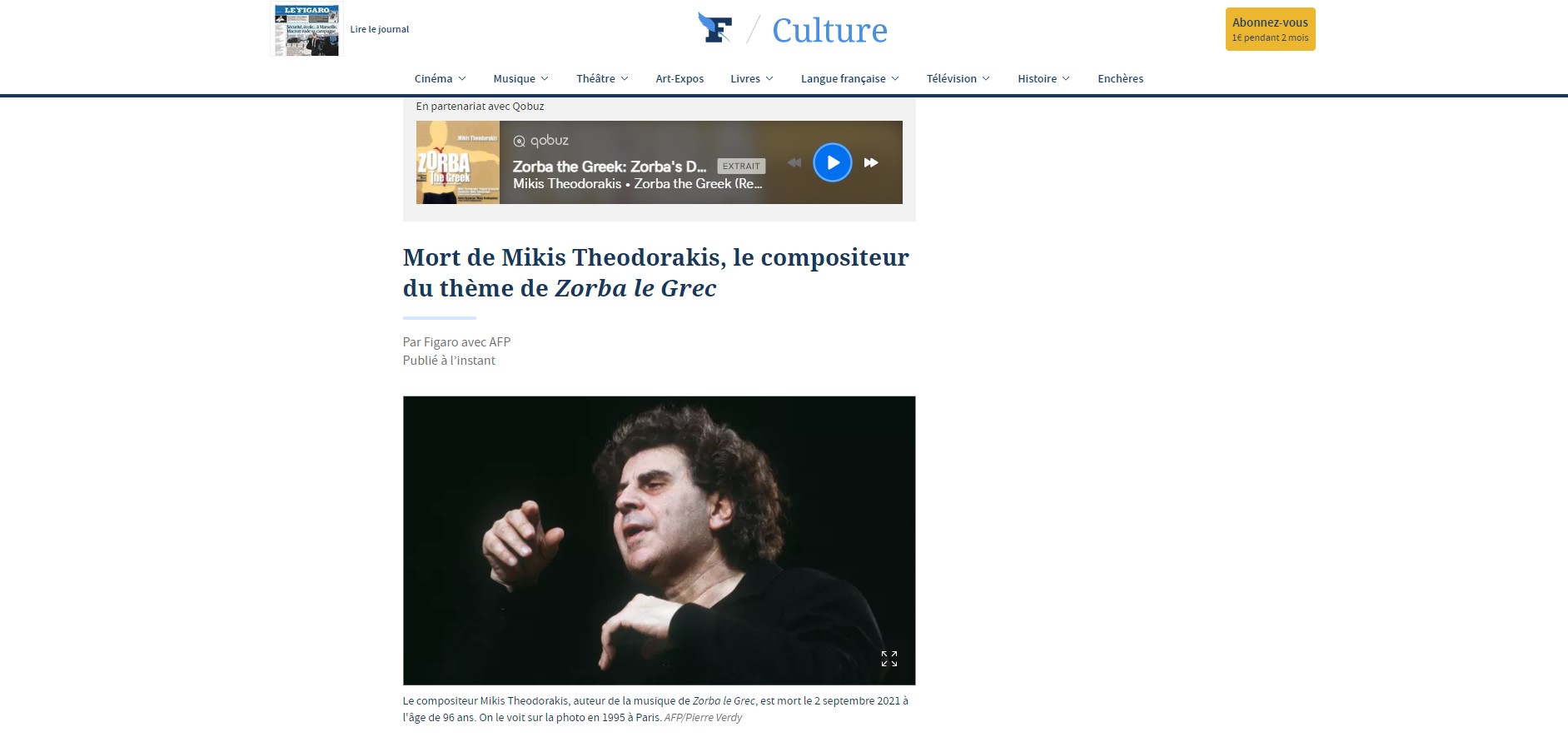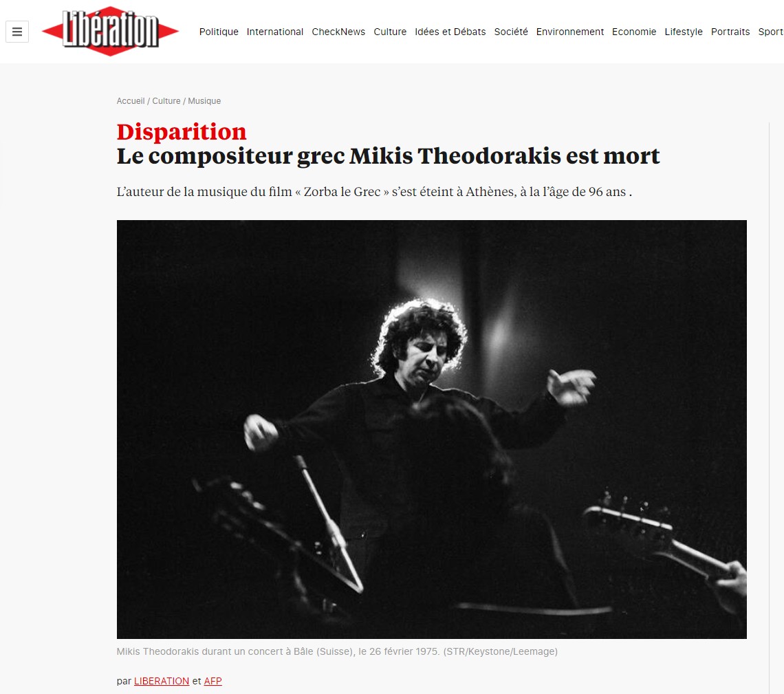 Le Figaro: Θάνατος του Μίκη Θεοδωράκη, συνθέτη του μουσικού θέματος του «Ζορμπά»