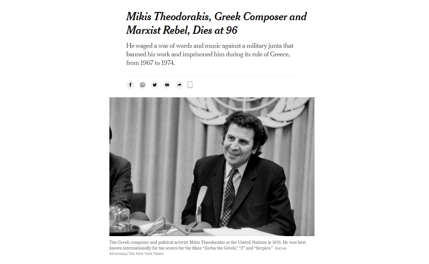 The New York Times: Πέθανε στα 96 του ο Μίκης Θεοδωράκης, Έλληνας συνθέτης και μαρξιστής αγωνιστής