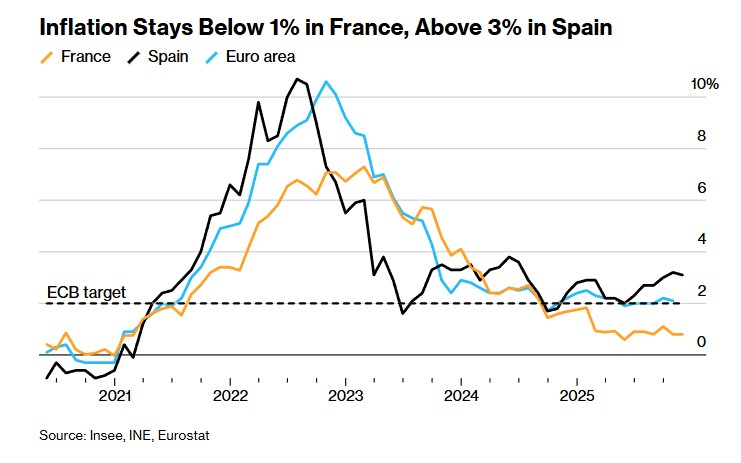 Ο πληθωρισμός στη Γαλλία παρέμεινε απροσδόκητα σταθερός τον Νοέμβριο, ενώ στην Ισπανία υποχώρησε λιγότερο από ό,τι είχαν προβλέψει οι αναλυτές, αναδεικνύοντας τη μεικτή εικόνα των τιμών σε δύο από τις σημαντικότερες οικονομίες της Ευρώπης. Ο πληθωρισμός στη Γαλλία παρέμεινε σταθερός στο 0,8%, διαψεύδοντας τις προβλέψεις ότι θα φτάσει στο 1%. Ο πληθωρισμός στην Ισπανία, εν τω μεταξύ, επιβραδύνθηκε στο 3,1%. Η μέση εκτίμηση σε μια έρευνα της Bloomberg προέβλεπε επιβράδυνση στο 3%. Ο πληθωρισμός παραμένει κάτω από 1% στη Γαλλία και πάνω από 3% στην Ισπανία.