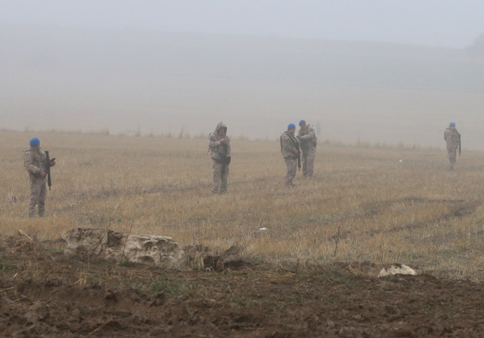 Τούρκοι στρατιώτες ασφαλίζουν την περιοχή, ενώ προσωπικό της Τουρκικής Αρχής Διαχείρισης Καταστροφών και Εκτάκτων Αναγκών ερευνά τον τόπο συντριβής του αεροσκάφους που μετέφερε τον αρχηγό του στρατού της Λιβύης © EPA/NECATI SAVAS