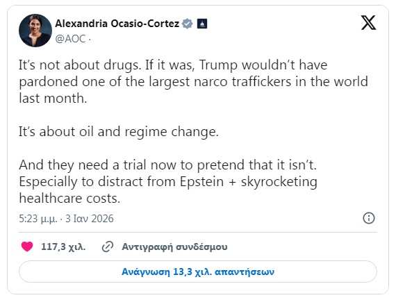 «Δεν έγινε για τα ναρκωτικά. Αν αυτός ήταν ο λόγος, ο Τραμπ δεν θα είχε δώσει χάρη σε έναν από τους μεγαλύτερους εμπόρους ναρκωτικών στον κόσμο. Γίνεται για το πετρέλαιο και την αλλαγή του καθεστώτος. Και χρειάζονται μια δίκη τώρα, για να παραστήσουν ότι δεν είναι έτσι. Ειδικά σαν αντιπερισπασμό από την υπόθεση Έπσταϊν και τα πολύ υψηλά κόστη για την υγεία» έγραψε η Οκάσιο-Κορτέζ.