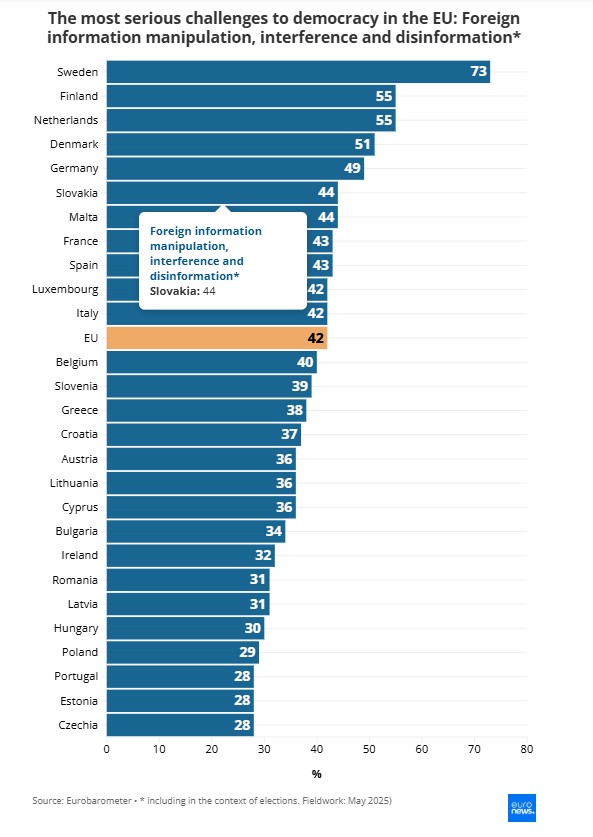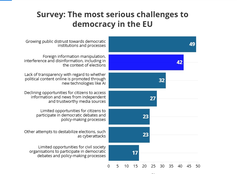 Σύμφωνα με την έρευνα, η «χειραγώγηση της πληροφόρησης από το εξωτερικό, οι παρεμβάσεις και η παραπληροφόρηση, μεταξύ άλλων στο πλαίσιο των εκλογών», θεωρείται η δεύτερη σοβαρότερη πρόκληση για την ΕΕ, με πάνω από δύο στους πέντε Ευρωπαίους (42%) να συμμερίζονται αυτή την άποψη. Σε ορισμένες χώρες, το ποσοστό ξεπερνά το 50%, ενώ στην Ελλάδα διαμορφώνεται στο 38%.