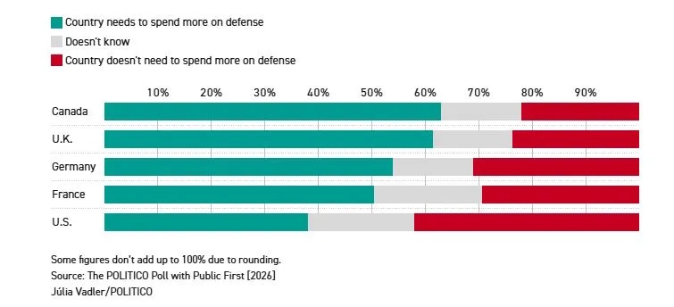 Η πλειοψηφία των ψηφοφόρων στη Γαλλία, τη Γερμανία, το Ηνωμένο Βασίλειο και τον Καναδά δήλωσε ότι η χώρα τους πρέπει να δαπανήσει περισσότερα για την άμυνα, με αυτή την πεποίθηση να είναι ισχυρότερη στο Ηνωμένο Βασίλειο και τον Καναδά.