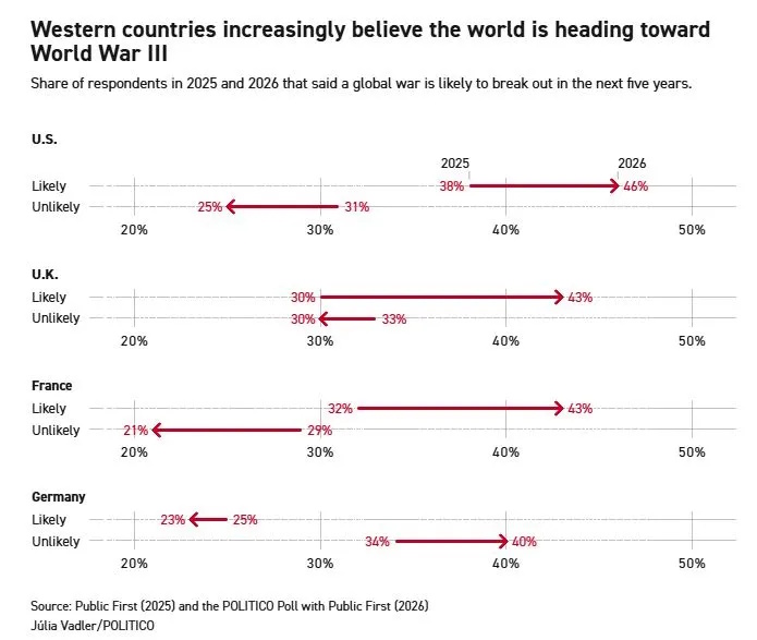 Το ποσοστό των ψηφοφόρων που προβλέπουν μια νέα παγκόσμια σύγκρουση έχει αυξηθεί σημαντικά από τότε που η εταιρεία δημοσκοπήσεων Public First έθεσε το ερώτημα αυτό τον Μάρτιο του 2025. «Η αλλαγή στη στάση του δυτικού κοινού σε λιγότερο από ένα χρόνο αντικατοπτρίζει μια δραματική μετακίνηση προς έναν πιο ανασφαλή κόσμο, όπου ο πόλεμος θεωρείται πιθανός και οι συμμαχίες είναι ασταθείς», δήλωσε ο Seb Wride, επικεφαλής δημοσκοπήσεων της Public First.
