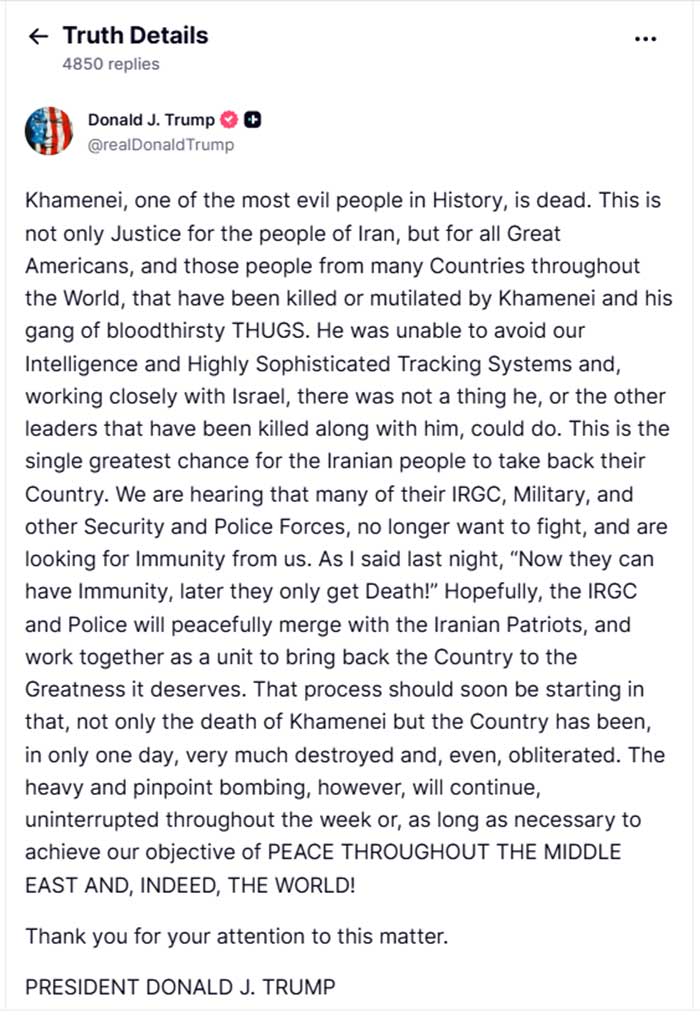 Και κατέληξε, λέγοντας: «Αυτή η διαδικασία θα πρέπει να ξεκινήσει σύντομα, καθώς όχι μόνο ο θάνατος του Χαμενεΐ, αλλά και η χώρα έχουν, σε μία μόνο μέρα, καταστραφεί σε μεγάλο βαθμό και, μάλιστα, εξαφανιστεί. Ωστόσο, οι βαριές και ακριβείς βομβιστικές επιθέσεις θα συνεχιστούν αδιάκοπα καθ’ όλη τη διάρκεια της εβδομάδας ή για όσο διάστημα είναι απαραίτητο, προκειμένου να επιτύχουμε τον στόχο μας για ΕΙΡΗΝΗ ΣΕ ΟΛΗ ΤΗ ΜΕΣΗ ΑΝΑΤΟΛΗ ΚΑΙ, ΠΡΑΓΜΑΤΙΚΑ, ΣΕ ΟΛΟ ΤΟΝ ΚΟΣΜΟ!».