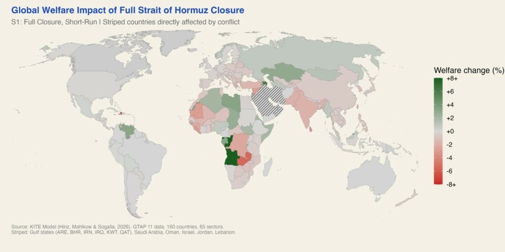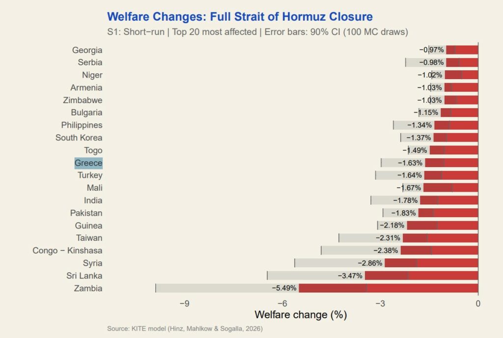 Πέρα από τα τρόφιμα, η συνολική ευημερία (Welfare) της Ελλάδας αναμένεται να μειωθεί κατά -1,63% σε βραχυπρόθεσμο επίπεδο, μια απώλεια που είναι από τις υψηλότερες ανάμεσα στις αναπτυγμένες οικονομίες. Συγκριτικά, οι απώλειες για τη συνολική Ευρωπαϊκή Ένωση (EU27) εκτιμώνται στο -0,40%, ενώ οι ΗΠΑ επηρεάζονται ελάχιστα με μόλις -0,07%.