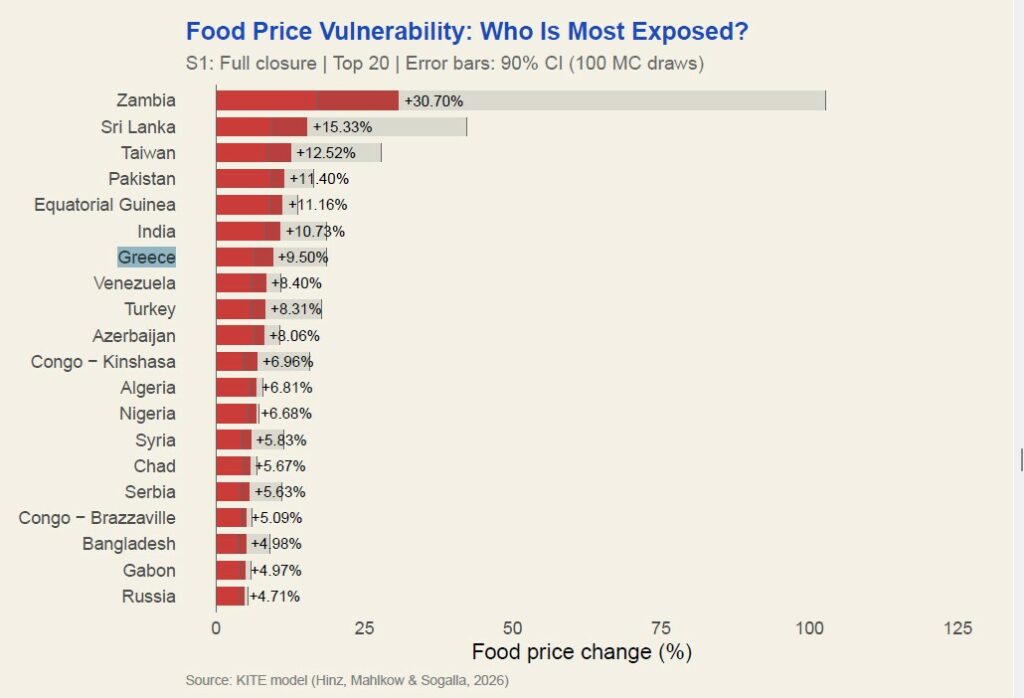 Η Ελλάδα αναδεικνύεται σε μία από τις πλέον εκτεθειμένες χώρες παγκοσμίως στις παρενέργειες του κλεισίματος των Στενών του Ορμούζ. Σύμφωνα με τα ευρήματα που παρουσιάζει η έκθεση του Ινστιτούτου του Κιέλου, η χώρα μας βρίσκεται στην πρώτη δεκάδα των κρατών που θα υποστούν τις μεγαλύτερες αυξήσεις στις τιμές των τροφίμων, με την προβλεπόμενη αύξηση να αγγίζει το 9,5%. Το ποσοστό αυτό τοποθετεί την Ελλάδα σε μια εξαιρετικά δυσμενή θέση, πάνω από χώρες όπως η Βενεζουέλα (+8,4%) και η Τουρκία (+8,31%).