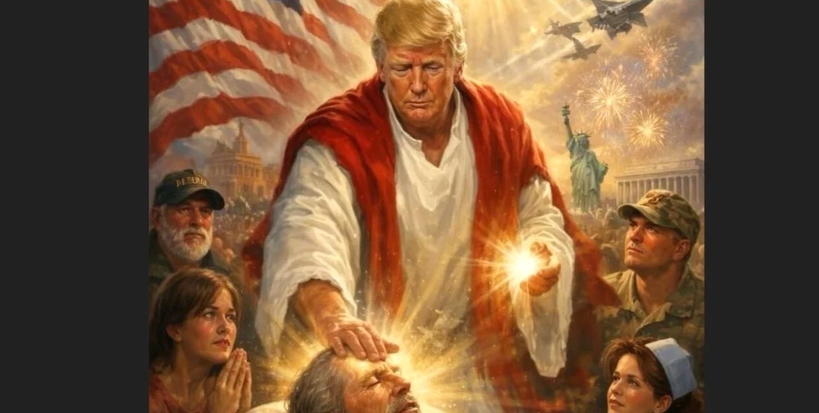 Στην επίμαχη φωτογραφία που αποτελεί προϊόν τεχνητής νοημοσύνης, ο Αμερικανός πρόεδρος απεικονίζεται σαν τον Χριστό, να «θεραπεύει» έναν άρρωστο σε νοσοκομείο λουσμένος από το θείο φως, ενώ καθόλου τυχαία είναι ντυμένος με τα παπικά χρώματα και η αμερικανική σημαία ξεπροβάλει πάνω από τον ώμο του.