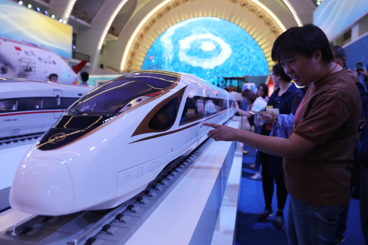 Επισκέπτες σε έκθεση στον εκθεσιακό χώρο του Πεκίνου με τα μεγαλύτερα επιτεύγματα της τελευταίας δεκαετίας, επιθεωρούν μοντέλο του τρένου-σφαιρα Fuxing EPA/WU HONG