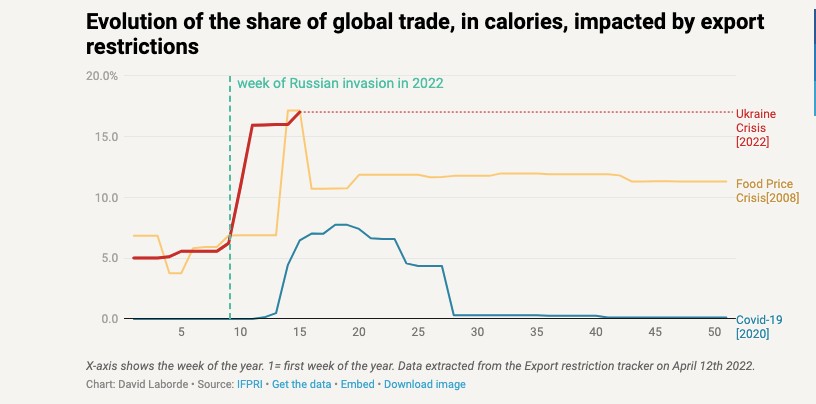 Όπως αναφέρει ο Νταβίντ Λαμπόρντ, συνεργαζόμενος ερευνητής στο IFPRI, οι εξαγωγικοί περιορισμοί δημιουργούν ένα «φαινόμενο ντόμινο», περιορίζοντας τις παγκόσμιες προμήθειες για αυτούς που πραγματικά τις χρειάζονται. «Καταλήγεις να υπονομεύεις το παγκόσμιο εμπορικό σύστημα» σημείωσε, καθώς περιορίζοντας την πρόσβαση στις διεθνείς αγορές, οι περιορισμοί μειώνουν επίσης τα κίνητρα για τους αγρότες. «Πλήττεις το ίδιο σου το αγροτικό σύστημα και τις προμήθειες τροφίμων». Το αντίθετο επιχείρημα, είναι πως σε καταστάσεις έκτακτης ανάγκης, πρέπει να δοθεί προτεραιτότητα στις οικείες ανάγκες.
