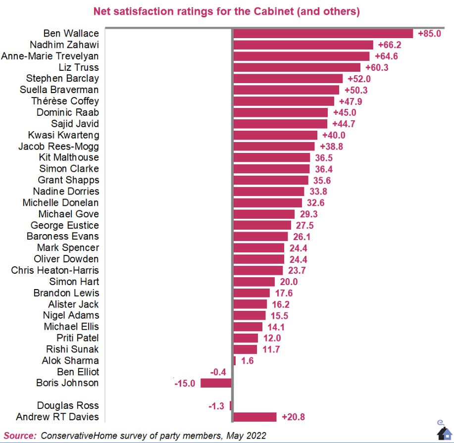 Ο υπουργός Άμυνας Μπεν Γουάλας βρίσκεται πρώτος στη λίστα των πιο αγαπημένων στελεχών της κυβέρνησης των Τόρις από το Conservative Home. Έχει πιστωθεί την επιτυχημένη ανταπόκριση της Βρετανίας εντός του ΝΑΤΟ στον πόλεμο στην Ουκρανία, ενώ είχε διαχειριστεί με επιτυχία και την αποχώρηση των Βρετανών από το Αφγανιστάν. Τη Δευτέρα προσήλθε στην ψηφοφορία στο πλευρό του Τζόνσον και έχει δηλώσει πως δεν τον ενδιαφέρει η διαδοχή, αλλά αυτό θα μπορούσε να αλλάξει.
