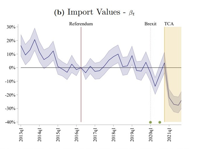 Η πτώση των εισαγωγών από την ΕΕ μετά την εφαρμογή της TCA, σύμφωνα με σχετική μελέτη του London School of Economics (LSE), ήταν απότομη και δεν έχει επανέλθει. Τον Ιανουάριο του 2021, οι βρετανικές εισαγωγές από την ΕΕ μειώθηκαν κατά σχεδόν 40% και παρέμειναν κάτω από τα επίπεδα του 2016 ως το τέλος του έτους.