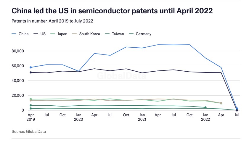 Τι συμβαίνει όμως με τους ημιαγωγούς; Ως τον Απρίλιο του 2022, η Κίνα ξεπερνούσε τις ΗΠΑ σε αριθμό ευρεσιτεχνιών που αφορούσαν τον συγκεκριμένο τομέα, σύμφωνα με στοιχεία από την GlobalData. Σύμφωνα με την εταιρεία, οι περιορισμοί λόγω Covid και οι αντίστοιχοι οικονομικοί περιορισμοί οδήγησαν σε πτώση τον Ιανουάριο και -κυρίως- τον Ιούλιο εκείνης της χρονιάς, κάτι που γίνεται εμφανές το καλοκαίρι του ’22 και στις ΗΠΑ, την Ιαπωνία, τη Ν. Κορέα, την Ταϊβάν και τη Γερμανία.
