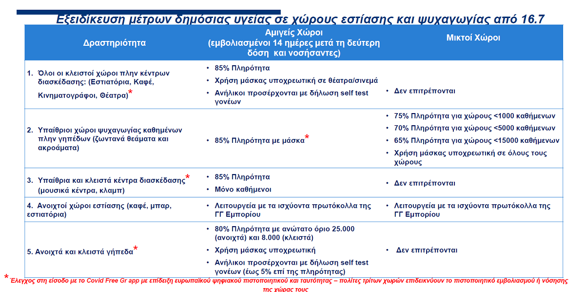 Οι επιχειρήσεις ζωντανού θεάματος, ακροάματος και λοιπών παραστατικών τεχνών αλλά και οι κλειστοί κινηματογράφοι, μπορούν να λειτουργήσουν αποκλειστικά για πλήρως εμβολιασμένους ή νοσήσαντες με τους παρακάτω όρους: