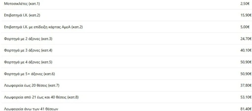 Για τα επιβατικά Ι.Χ., η αύξηση ανέρχεται σε 0,50 ευρώ, με την απλή διέλευση χωρίς χρήση e-pass να διαμορφώνεται πλέον στα 15,90 ευρώ, από 15,40 ευρώ που ίσχυε έως σήμερα. Αντίθετα, η τιμή για τις μοτοσυκλέτες παραμένει αμετάβλητη στα 2,50 ευρώ.