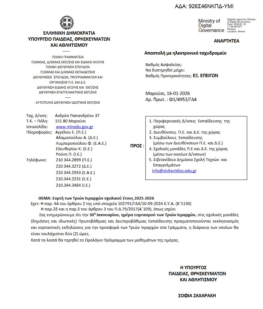 Με εγκύκλιο της, η υπουργός Παιδείας και Θρησκευμάτων Σοφία Ζαχαράκη ενημερώνει ότι την 30η Ιανουαρίου, ημέρα εορτασμού των Τριών Ιεραρχών, στις σχολικές μονάδες (δημόσιες και ιδιωτικές) Πρωτοβάθμιας και Δευτεροβάθμιας Εκπαίδευσης πραγματοποιούνται εκκλησιασμός και εορταστικές εκδηλώσεις για την προσφορά των Τριών Ιεραρχών στα Γράμματα, η διάρκεια των οποίων θα είναι τουλάχιστον δύο (2) ώρες.