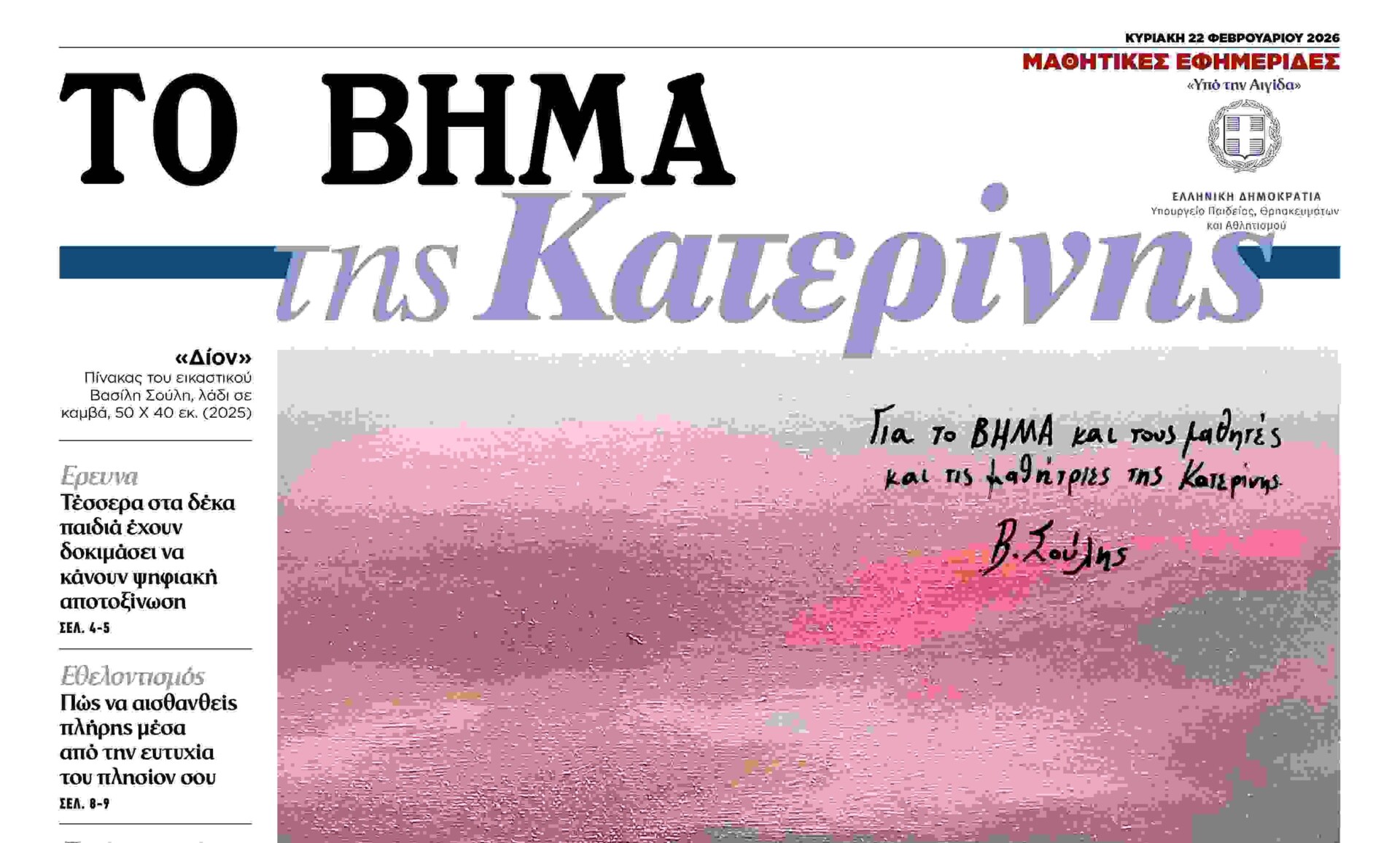 Με «Το ΒΗΜΑ» κυκλοφορεί, αυτή την Κυριακή 22 Φεβρουαρίου 2026 η μαθητική εφημερίδα «ΤΟ ΒΗΜΑ της Κατερίνης».