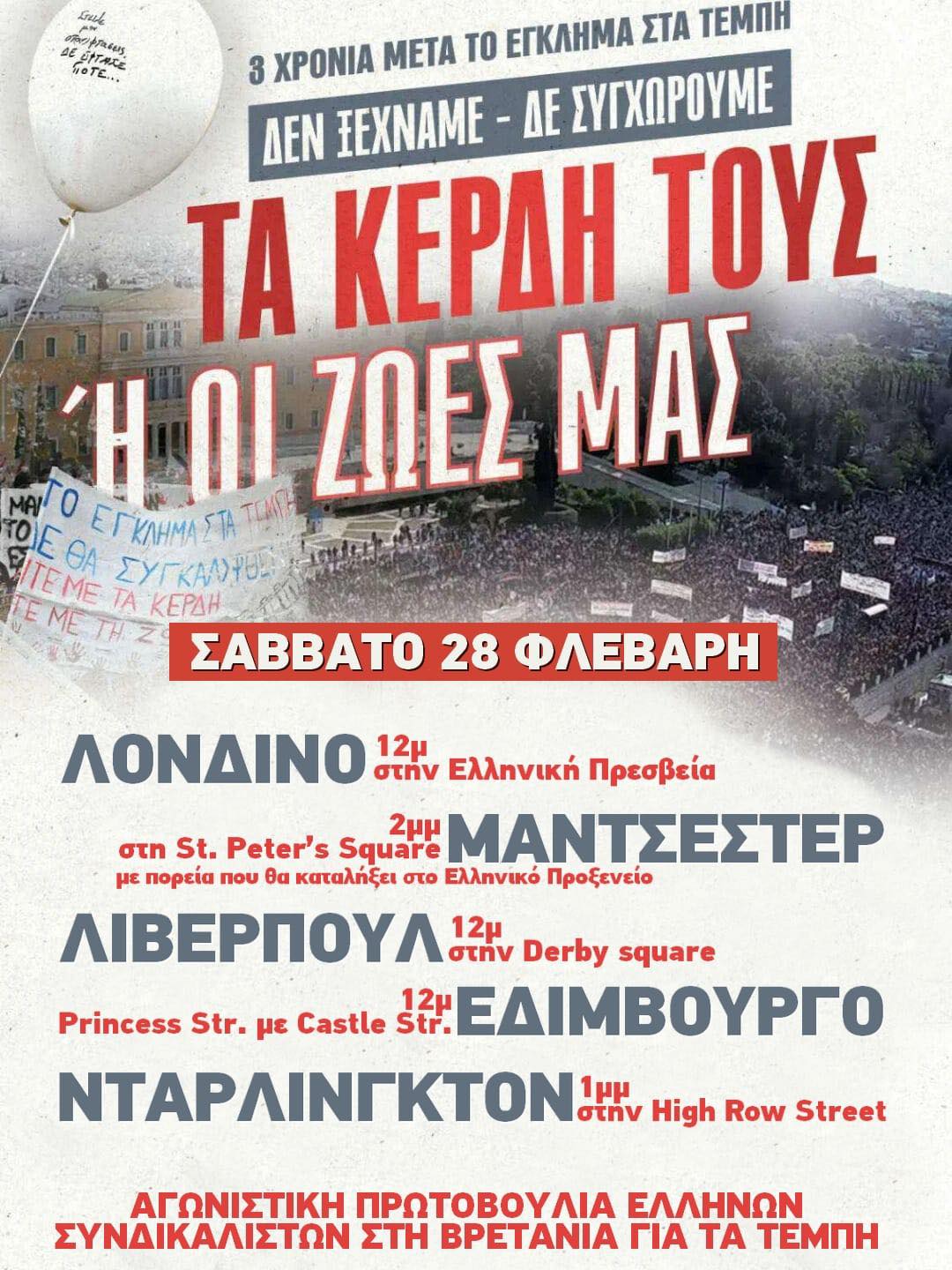 Συγκεντρώσεις σε δεκάδες πόλεις της Ελλάδας, αλλά και στο εξωτερικό προγραμματίζονται για τις 28 Φεβρουαρίου, με αφορμή τη συμπλήρωση τριών ετών από την τραγωδία στα Τέμπη που στοίχησε τη ζωή σε 57 ανθρώπους, ενώ δύο ημέρες νωρίτερα πραγματοποιούνται τα αποκαλυπτήρια μνημείου στην Καισαριανή.