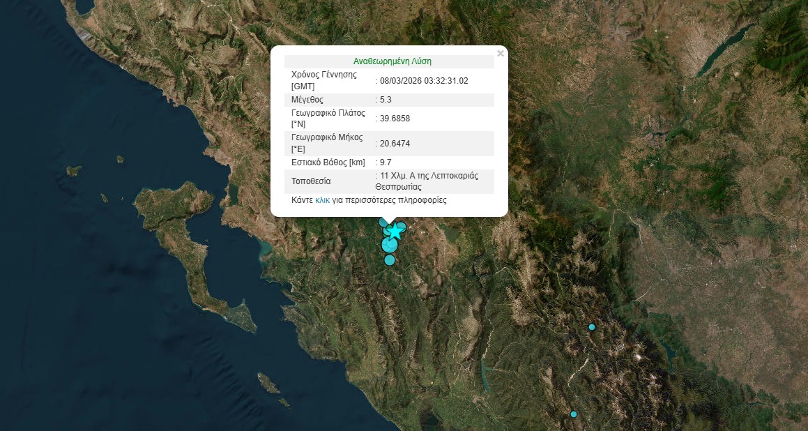 Σεισμική δόνηση μεγέθους 5,3 βαθμών της κλίμακας Ρίχτερ καταγράφηκε τα ξημερώματα της Κυριακής 8 Μαρτίου 2026, σύμφωνα με τα στοιχεία που εμφανίζονται στην αυτόματη λύση του Γεωδυναμικού Ινστιτούτου του Αστεροσκοπείου Αθηνών.