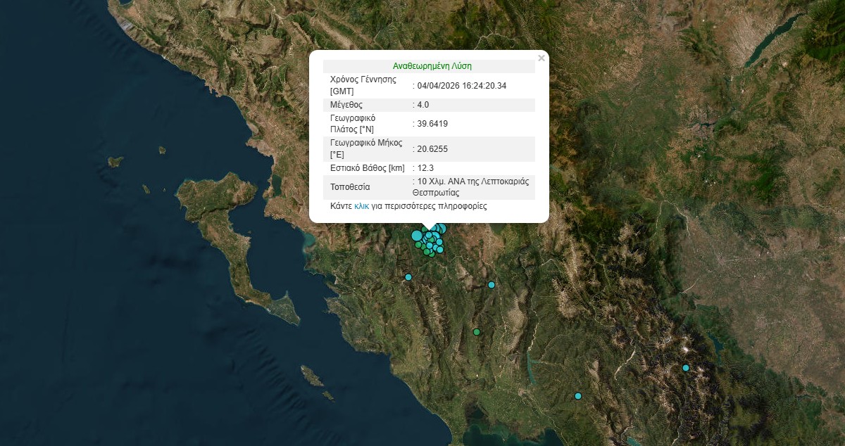 Σεισμός 4 Ρίχτερ σημειώθηκε στις 19:24 το Σάββατο (4/4) στη Θεσπρωτία. Ο σεισμός έγινε αισθητός σε μεγάλο μέρος των Νομών Ιωαννίνων και της Θεσπρωτίας καθώς και στην πόλη των Ιωαννίνων.