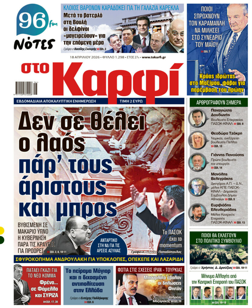 Μη χάσετε το Σάββατο 18 Απριλίου 2026 το αποκαλυπτικό «ΚΑΡΦΙ» που κυκλοφορεί σε όλα τα περίπτερα της χώρας με πλούσια θεματολογία και πολλές αποκλειστικότητες.