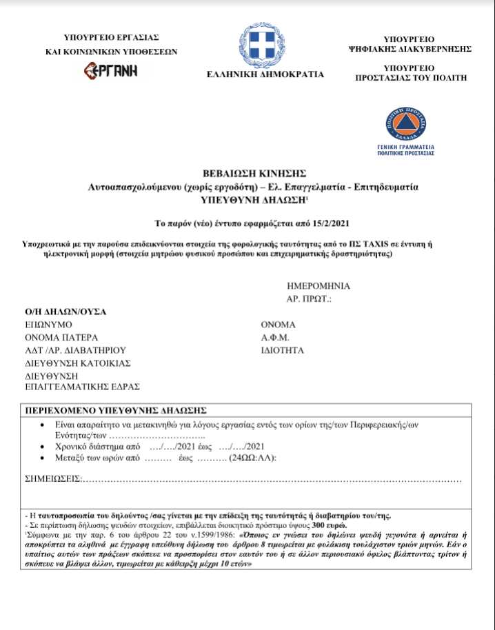 Με νέο έντυπο μέσω του ΠΣ ΕΡΓΑΝΗ ή από τον ιστότοπο https://forma.gov.gr μπορούν επίσης να μετακινούνται οι αυτοαπασχολούμενοι χωρίς εργοδότη, οι ελεύθεροι επαγγελματίες και οι επιτηδευματίες. Σε αυτή την περίπτωση θα πρέπει υποχρεωτικά το έντυπο να συνοδεύεται από τη φορολογική ταυτότητα τους, η οποία παρέχεται μέσω του TAXISNET (στοιχεία Μητρώου Φυσικού Προσώπου και Επιχειρηματικής Δραστηριότητας).