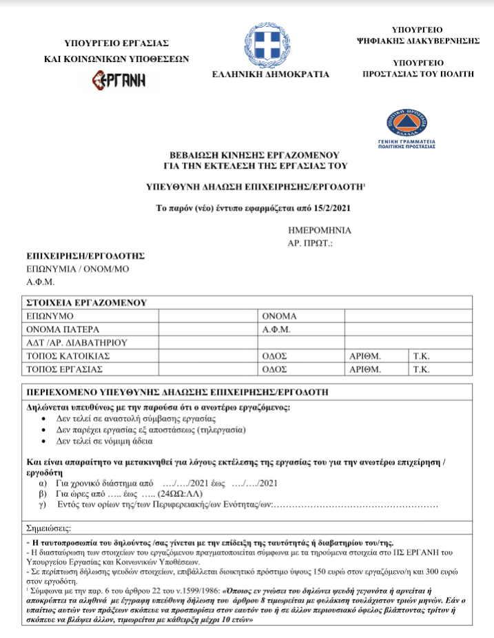 Βεβαίωση μετακίνησης: Στην επανέκδοση του εντύπου θα πρέπει να προχωρήσουν όλοι οι μισθωτοί από σήμερα Δευτέρα, 15 Φεβρουαρίου 2021.
