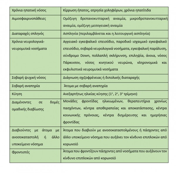 • σε διαβιούντες με άτομα σε ανοσοκαταστολή ή άλλο υποκείμενο νόσημα (βλ. Πίνακες 1 και 2)