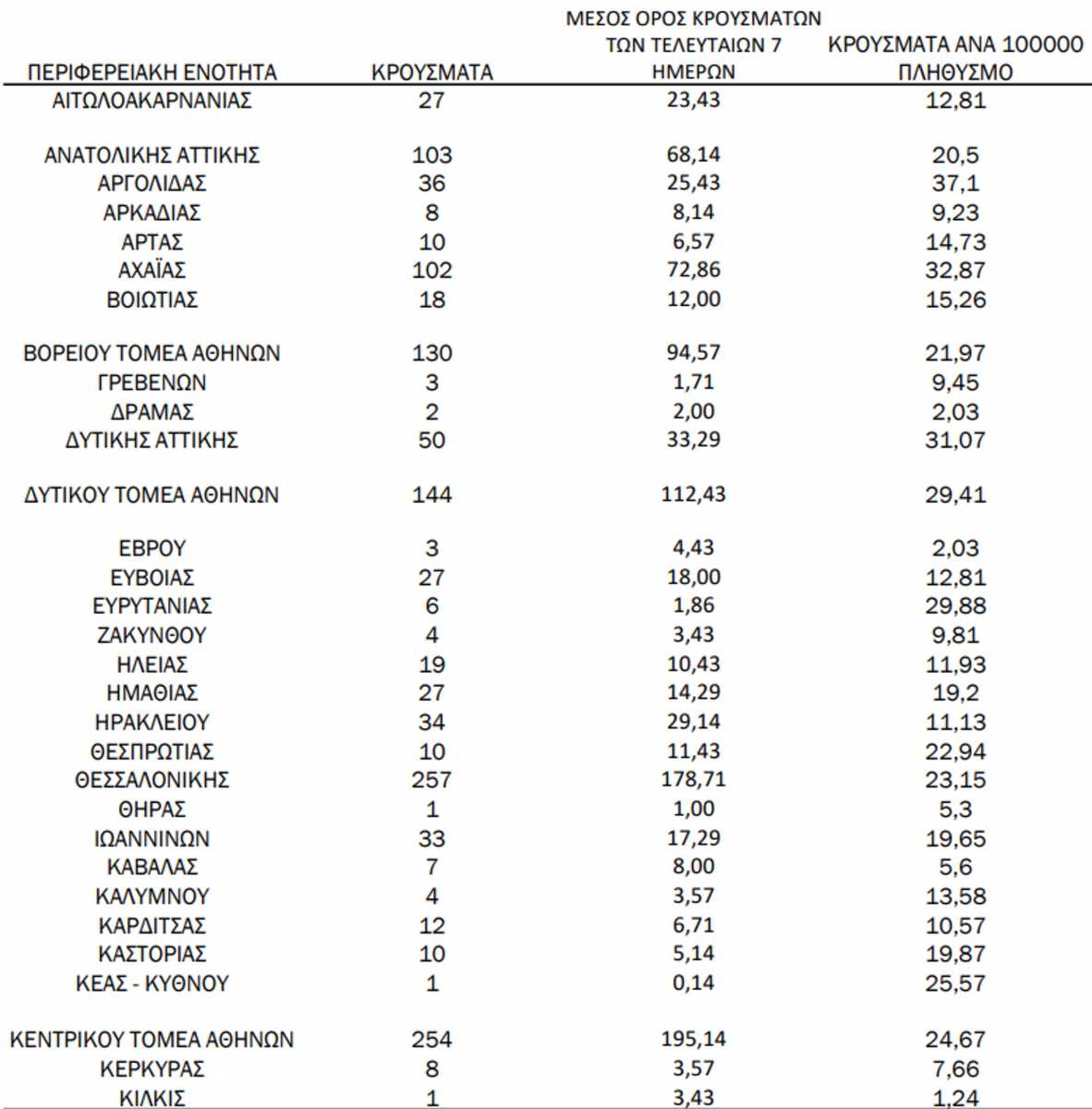 Η κατανομή των κρουσμάτων στην υπόλοιπη Ελλάδα διαμορφώνεται, σύμφωνα με τον ΕΟΔΥ ως εξής: