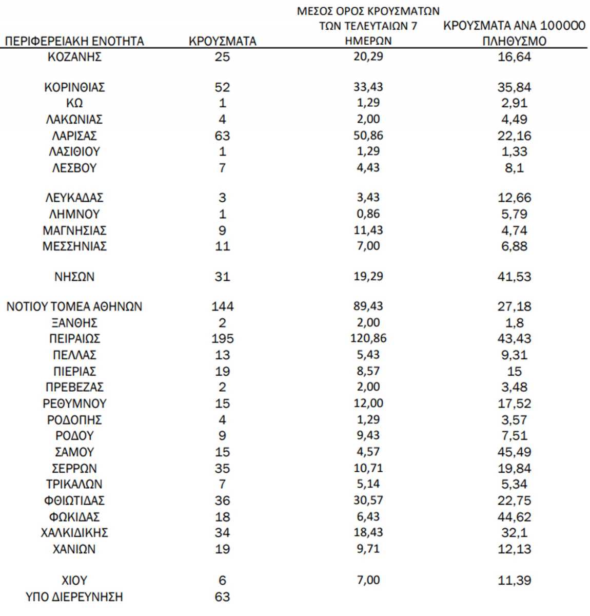 Η κατανομή των κρουσμάτων στην υπόλοιπη Ελλάδα