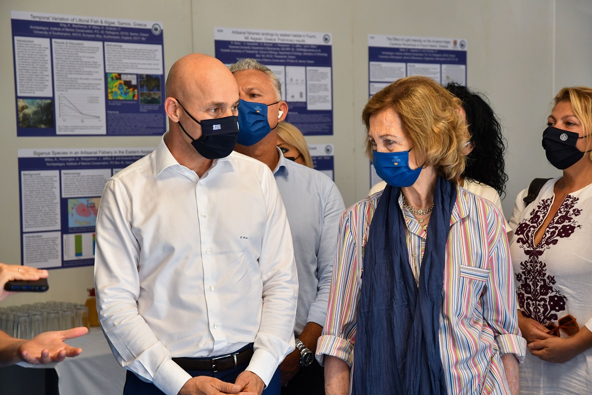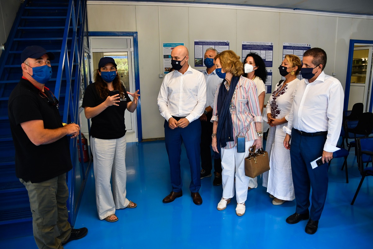 Όπως αναφέρεται, η βασίλισσα Σοφία περιηγήθηκε στις εγκαταστάσεις του Καταφυγίου Θαλάσσιας Ζωής Αιγαίου στον κόλπο της Βρουλιάς στην βορειοδυτική πλευρά του νησιού.