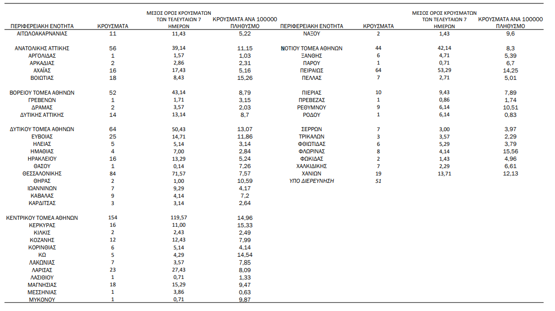Ακολουθεί ο «χάρτης» της διασποράς των κρουσμάτων ανά περιφερειακή ενότητα, σύμφωνα με την ανακοίνωση του ΕΟΔΥ: